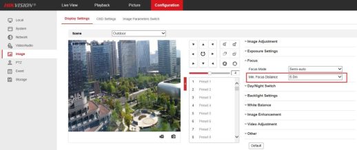 1)image1 518w218hGo to Configuration->Image->Display Setting->Focus interface, the Min. Focus Distance is recommended to be set to 6.0m for outdoor scene and 1.5m for indoor scene.
