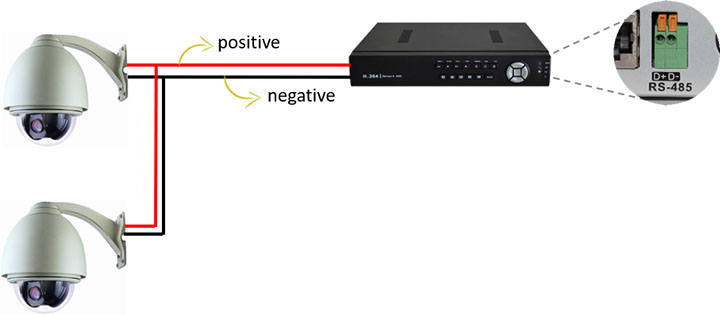 In this example, the cameras are connected to the DVR with a twisted pair cable that sends the commands through a universal connection standard and a protocol that the camera and the DVR have in common (such as Pelco P or D). The twisted pair wires must be connected to the back of the DVR into the RS-485 connector.