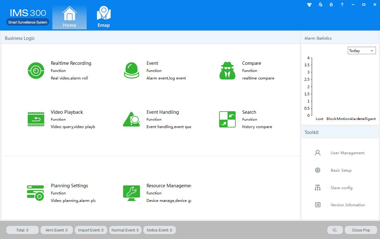 IMS300 is a professional surveillance system software which support muti-user, multi-window and multi-language , voice talk, EMap, alarm and etc. IM300 is compatible with various access devices. This is a stable, reliable and easy operation system.