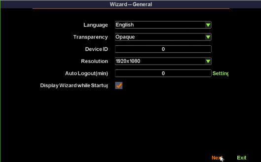 Setting 1: Set up system language,menu transparency,device number,auto logout time and whether the wizard window shows again when reboot.