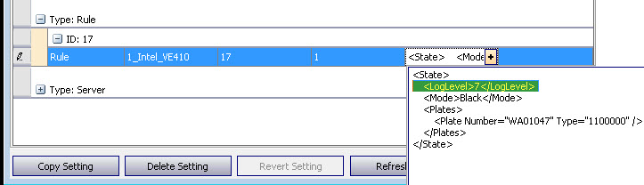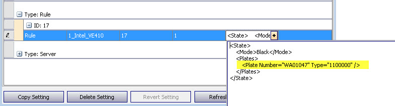 Dbupdater “update settings set V='<State><Mode>Black</Mode><RefreshXMLTime>5000</RefreshXMLTime><Plates><Plate Number=\”ABC123\” Type=\”0\” /><Plate Number=\”ABC456\” Type=\”0\” /></Plates></State>’ where Type=’Rule’ AND Id=8 AND Section=’1_Intel_VE410′ AND K=1″