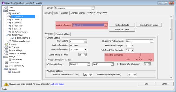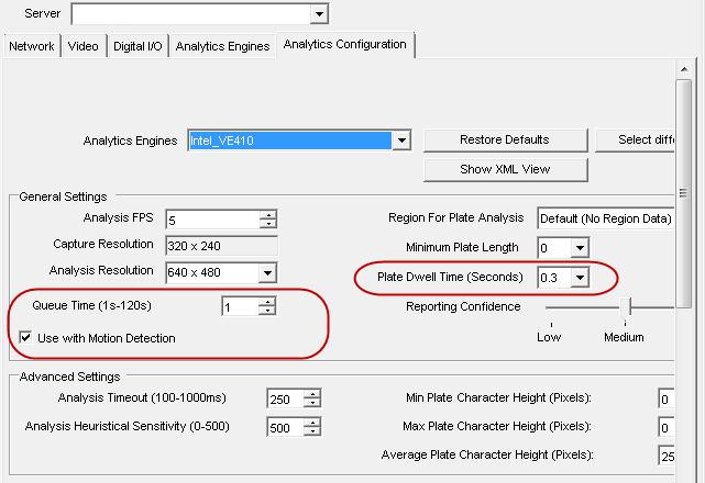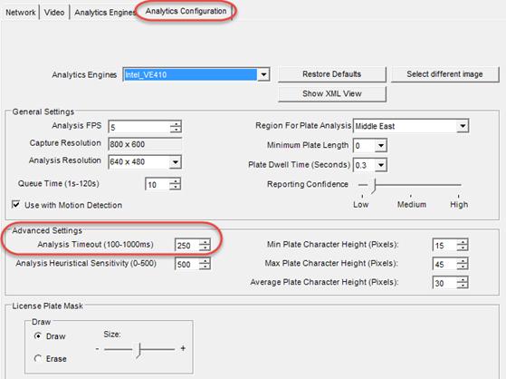 The Analysis Timeout setting available on the Analytics Configuration tab under Advanced Settings configures the maximum amount of time the algorithm spends attempting to detect a license plate in a frame.