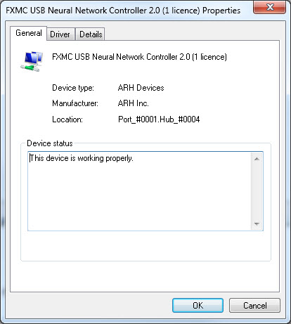 Double-click on FXMC USB Neural Network Controller. Device status should indicate that “This device is working properly.”