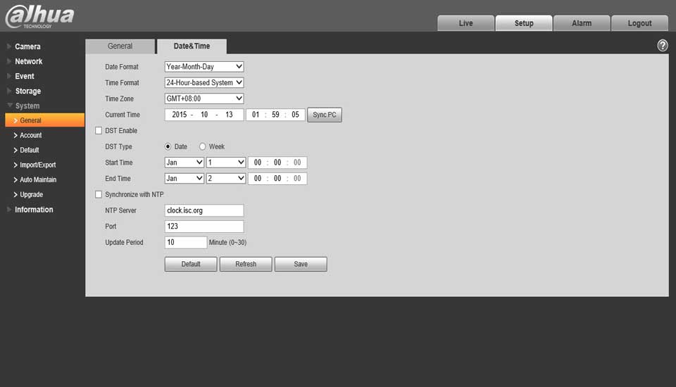 - Log into the web interface of the camera. Click on Setup, General and then the date and time option.