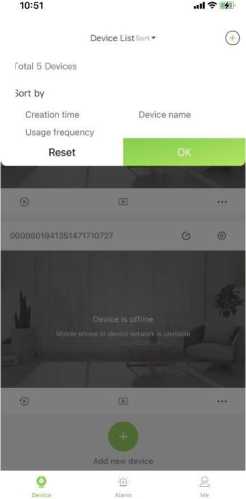 Click the top page of device list, it can display the total added device quantity number, and sort these devices via creation time / Device Name / Usage Frequency.
