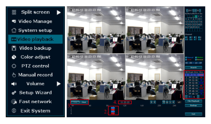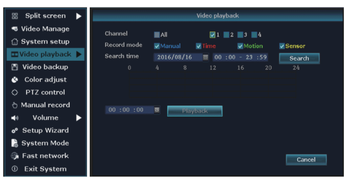 Step: Right click on main interface→video playback→choose “channel”→choose “record mode”→setup “search time”→click “search”, click timeline to choose time→click “playback” to check recording file.