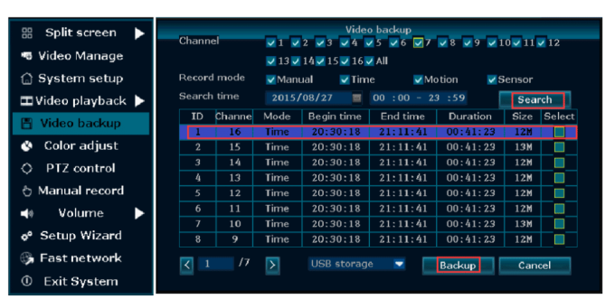 Steps: Right-click the mouse in the main menu→Video backup→choose channel No.→choose Record mode→In search time, input beginning time and end time→click search, and recording will come out→choose the video which needs to be backup→click video backup.