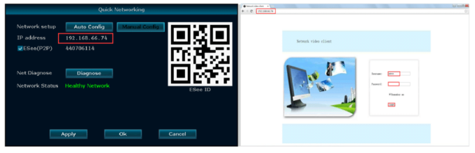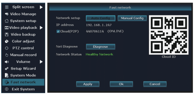 Step: Right-click the mouse in the main menu → Fast network → Choose Auto Config → Click OK. If you want to manually configure the IP address, click diagnose. If it shows a healthy network, it indicates the connection to the Internet is good. If there is a network anomaly, plz process according to the clew. (Ensure your device has accessed the network)