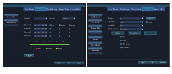 Step 1: Right click mouse in main menu→System setup→Record setup→Record plan→choose motion→choose all→click Copy to→click OK to save setting