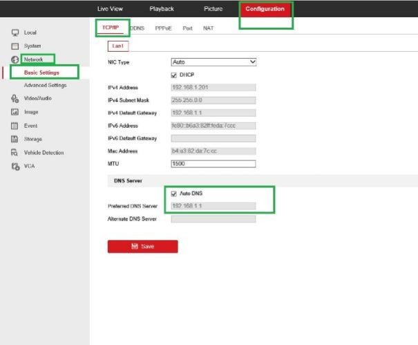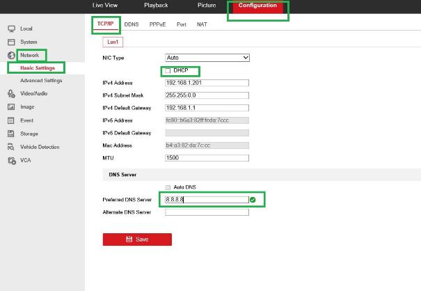 Go to Configuration Network Basic Settings TCP/IP Uncheck “DHCP“ Uncheck “Auto DNS” and input 8.8.8.8 for “Preferred DNS Server”. Click “Save”