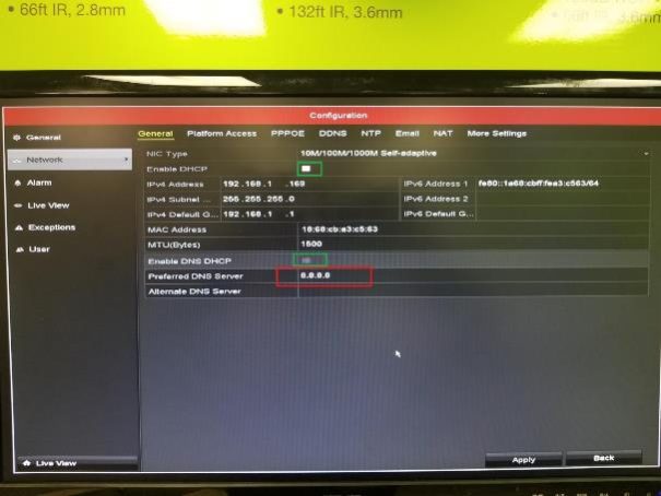 (Note: If “Enable DHCP” is checked, you can check the option “Enable DNS DHCP” which will let the NVR/DVR pullup its own Preferred DNS Server)