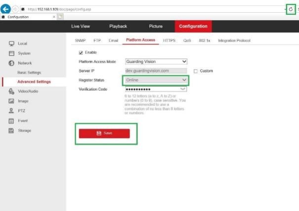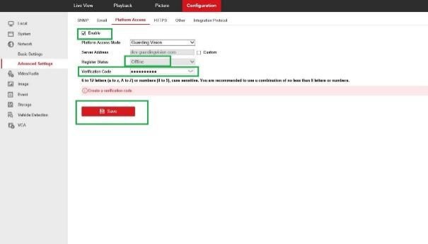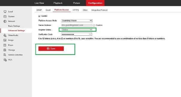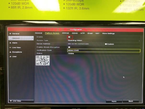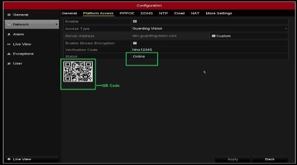 Step 7: Click “Apply” to apply the settings. The status will change to “Online”. The QR Code being displayed on your device “Platform Access” page can be scanned with Guarding Vision app to add the device into your App. To proceed with adding the device into the app scroll down to “Adding NVR/DVR to Guarding Vision App”.