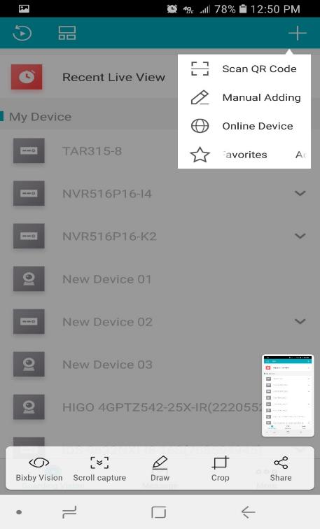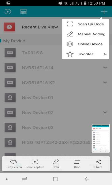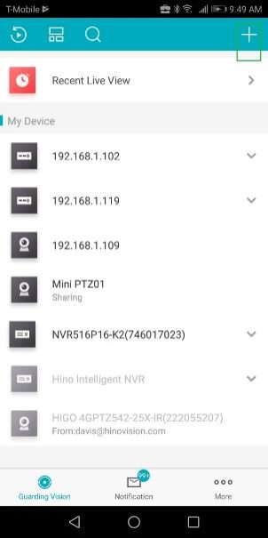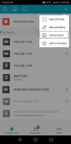 Step 1: Open Guarding vision App and select “Guarding Vision” on the bottom of the App. Click on the “+” icon on the top right to access adding menu.