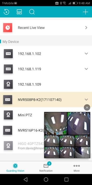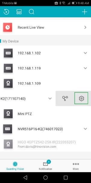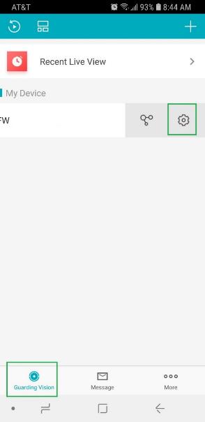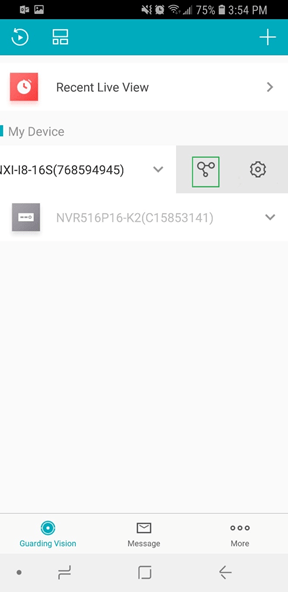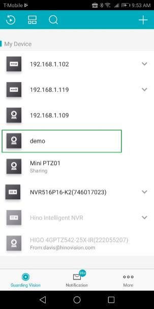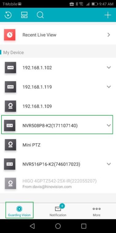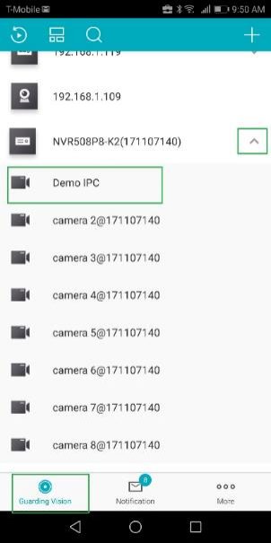 Step 7: Tap on “Guarding Vision” at the bottom of the app to see your device listed. Tap on the device name to view the cameras connected to the device.