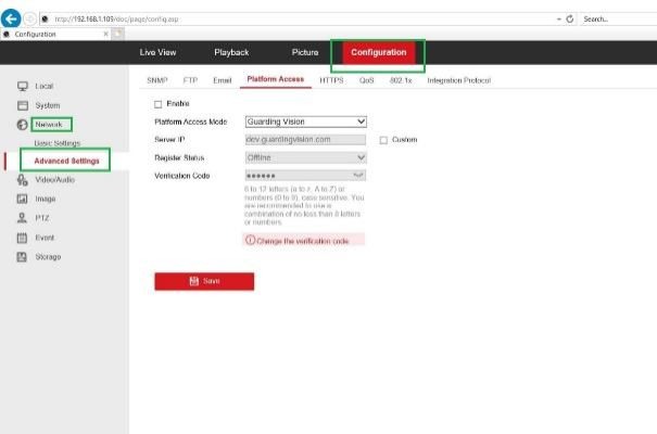 Step 1: Log in to the IP Camera with internet explorer and Go to Configuration Network Advanced Settings Platform Access