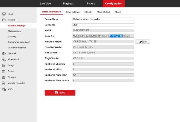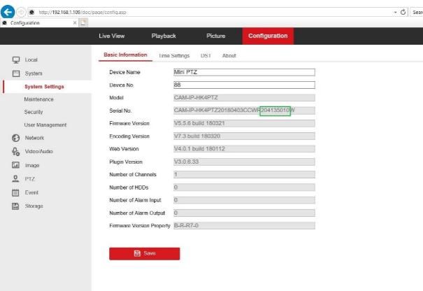 Step 2: The serial number can be accessed from the device sticker. To access the serial number from the web config, go to Configuration System System Settings Basic Information