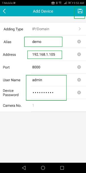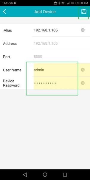 Step 4: in the “Add Device” page, input the Username and Password for the device and click on