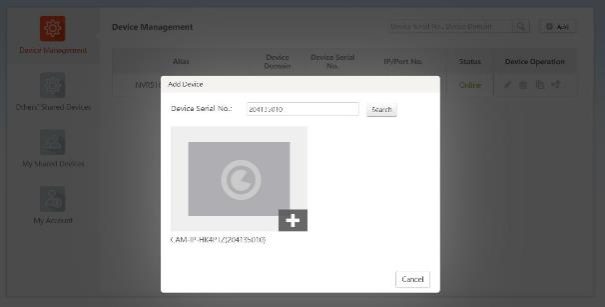 Step 4: In the “Add Device” pop-up window, input the device serial number (Last 9 digits of the serial number found on the device sticker) and click on “Search”.