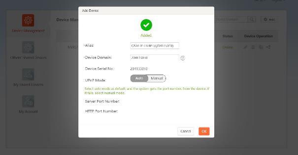 Step 7: Click “OK”. Now the device should be added into the Guarding vision account. To view video stream, download the Guarding vision ass on your mobile phone and login with the account credentials just created.