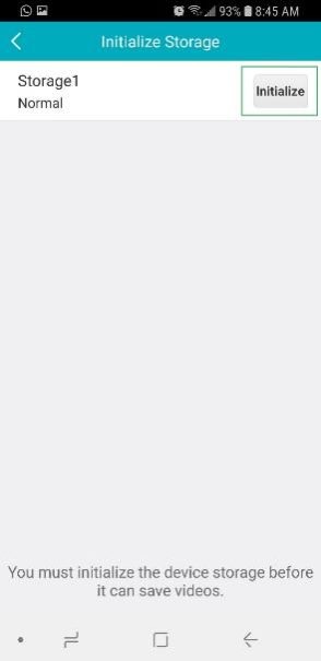 Step 4: In the initialize storage page, select Initialize. This will format or initialize the sd card and the sd card should be ready for recording.