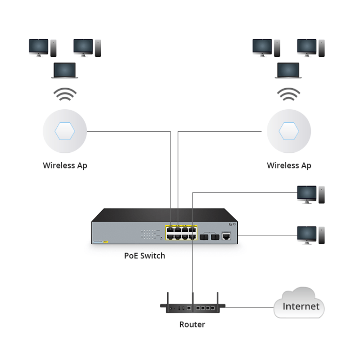 Building wireless networks via PoE switch is more efficient than PoE injectors. To build an enterprise PoE wireless network, the Power over Ethernet switch connects to a router that connects to the Internet. The network provides network connectivity among PoE wireless network devices and computers that have a wired connection to the switch. The PoE wireless access points connect to the PoE switch, providing them with power. Each wireless access point connects multiple wireless devices to the network.