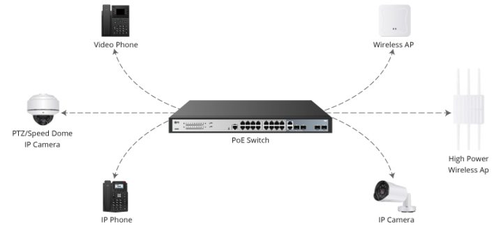 A PoE switch is a network switch that has built-in PoE functionality, allowing it to provide power to connected devices directly through the Ethernet cable. This means that you can connect PoE-enabled devices such as IP cameras and wireless access points directly to the PoE switch using Ethernet cables, and the switch will automatically provide power to the devices without requiring any additional equipment.