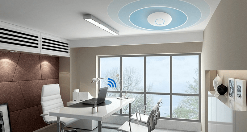 The picture below shows a wireless network in an office. The wireless AP is installed on the ceiling. Cat5e or Cat6 network cable delivers data and power from the nearest PoE switch. Compared with the PoE injector, using a PoE Ethernet switch to power the AP is more efficient for the wireless network because you don’t need to worry about the power outlets. In addition, you don’t have to specifically buy a Cat5e or Cat6 Ethernet cable for power transmission.
