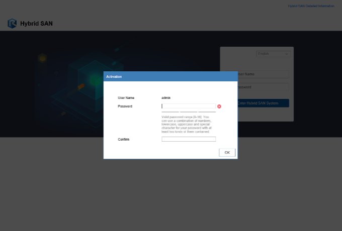• The Hybrid SAN System web interface is the last step needed to configure the storage server for deployment. The steps below will help to log in, create a password, and initialize the drives (format).