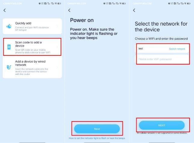 1. Select Scan code to add a device, click Next, select your wifi and enter your wifi password and click Next.