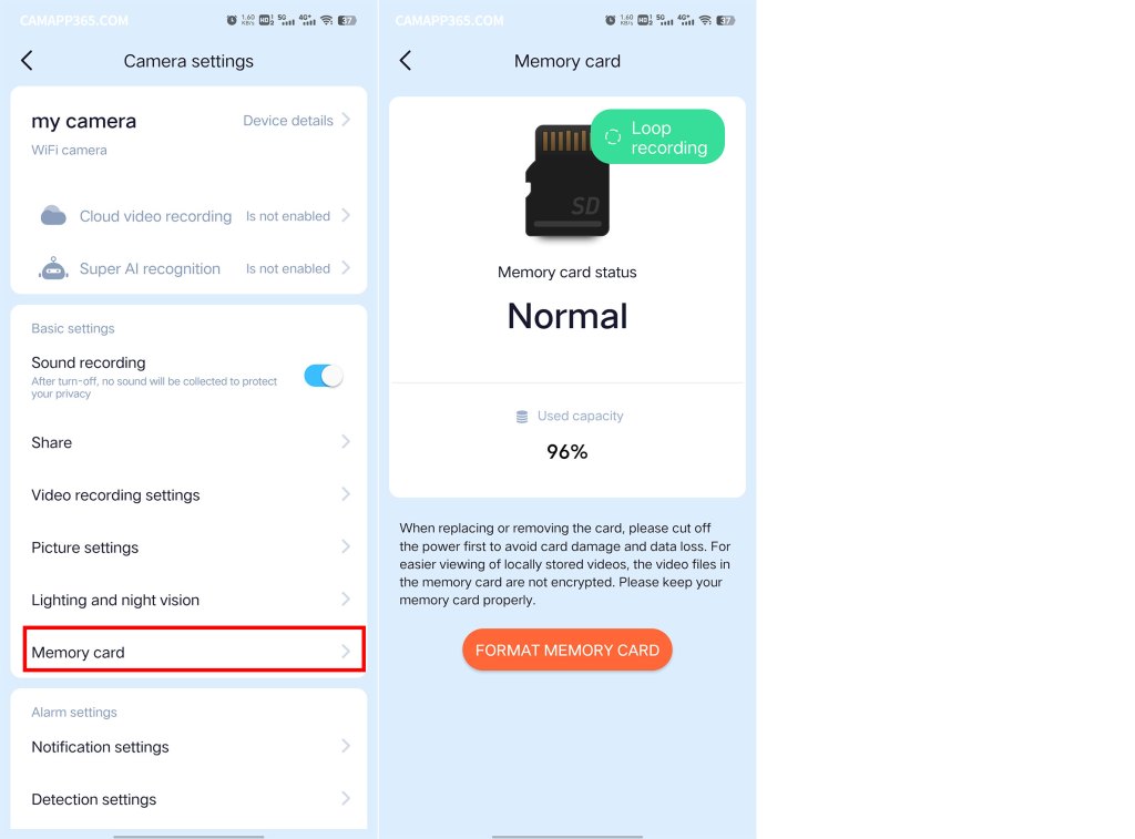 1. Insert the memory card into the iCam365 camera, then enter the Memory card interface to see if the camera reads the memory card.