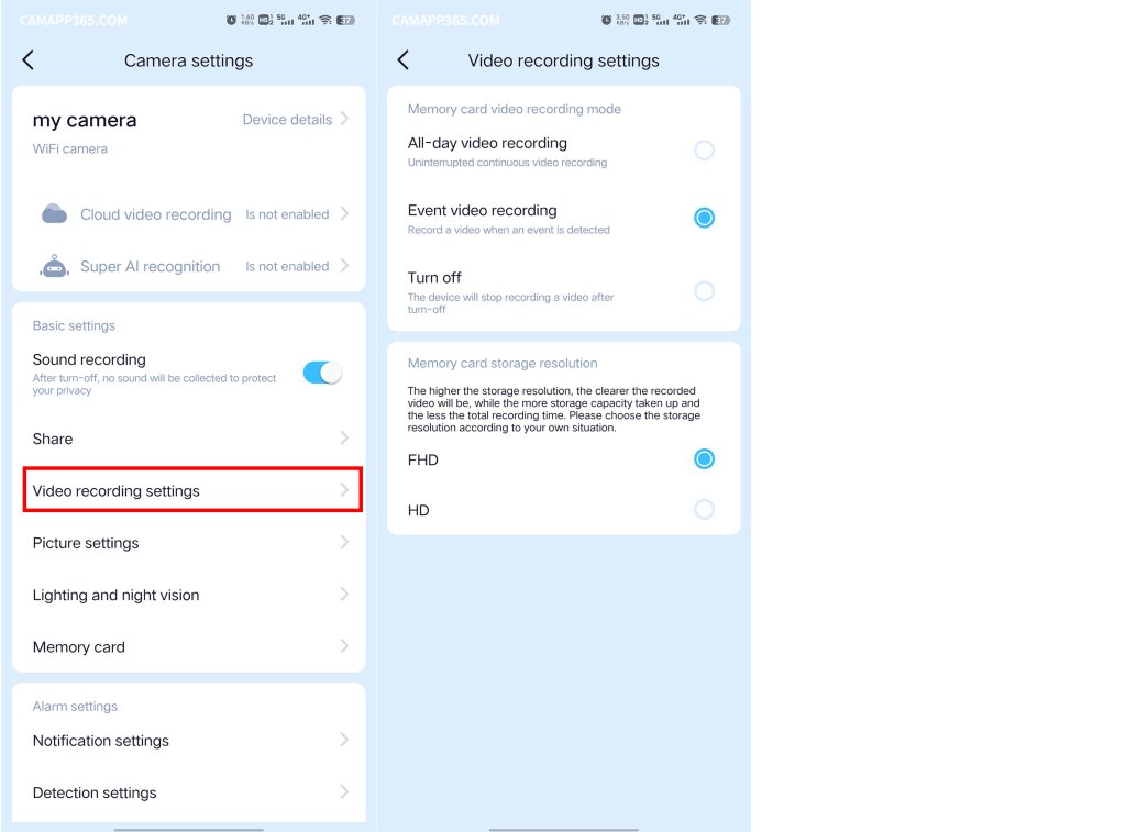 Video Definition: The higher the storage resolution, the clearer the recorded video will be, while the more storage capacity taken up and the less the total recording time. Please choose the storage resolution according to your own situation.