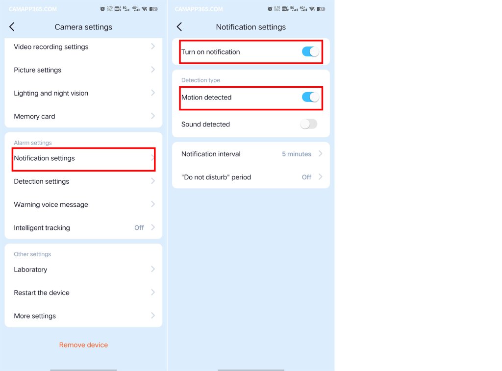 2. Click Notification settings, open Turn on notification and Motion detected to detect and receive alarm notifications.