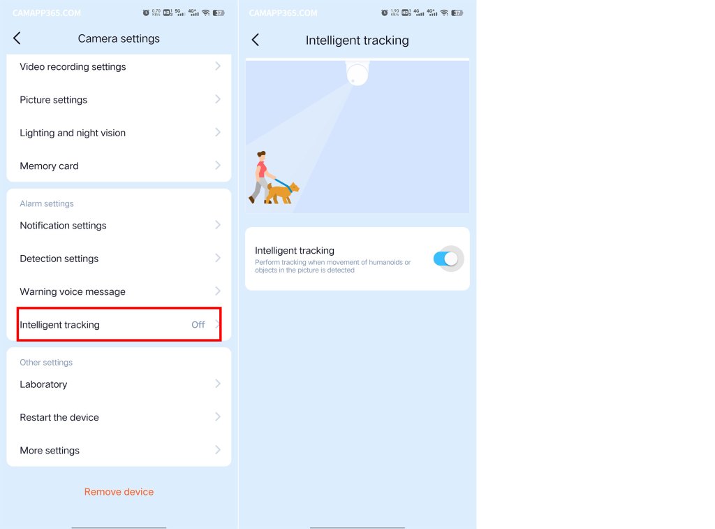 Turn on Intelligent tracking, when iCam365 camera detects human or pet movement, the camera will track the movement of the object.