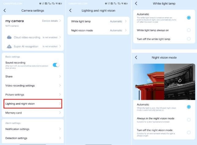 In the Lighting and night vision screen, you can set the light lamp and Night vision mode.