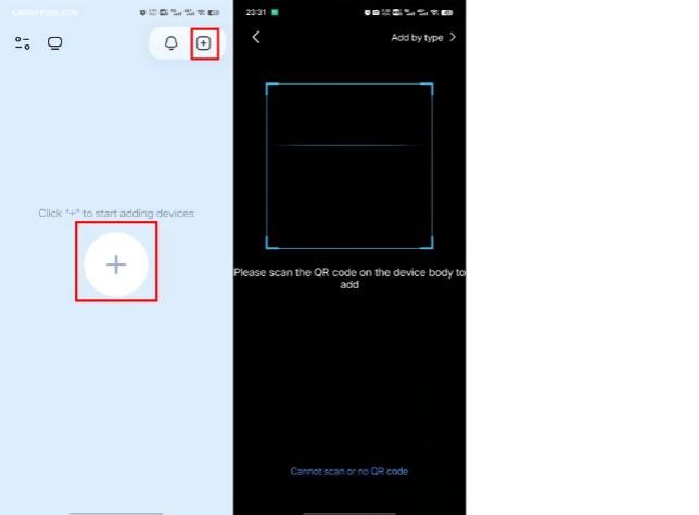Click the + icon, then scan the QR code on the iCam365 camera, the QR code is usually on the bottom or back of the camera. iCam365 APP will show the recommended way to add.