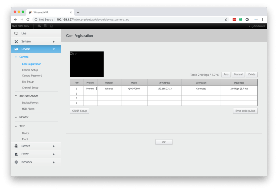 Login to the Samsung Wisenet NVR and go to Setup > Device > Camera > Cam Registration