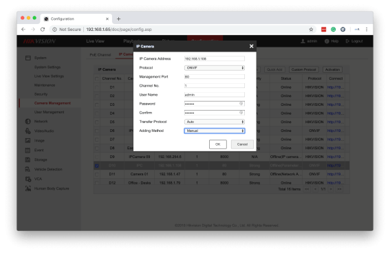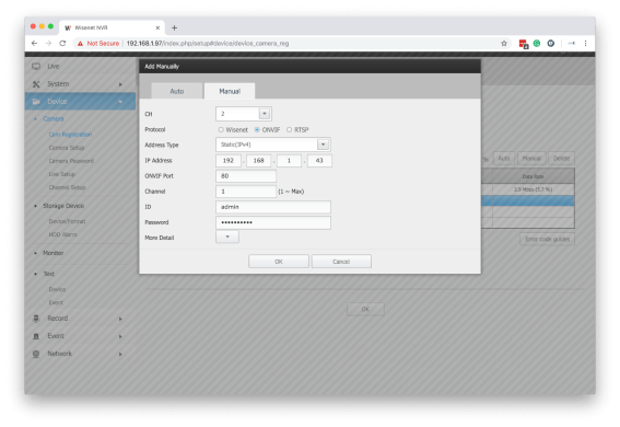 Step 2. Select an empty channel from the table and click the manual button at the top of the page, a popup will appear asking for the details of the camera