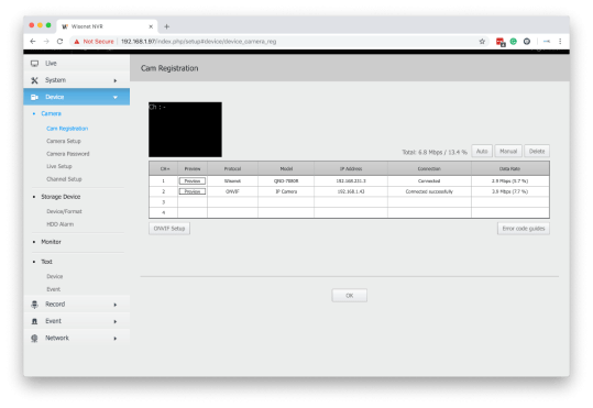 Step 4. Once a successful connection has been made with the camera a popup will appear asking if want to register the camera, simply click OK and in the table it will say connected successfully