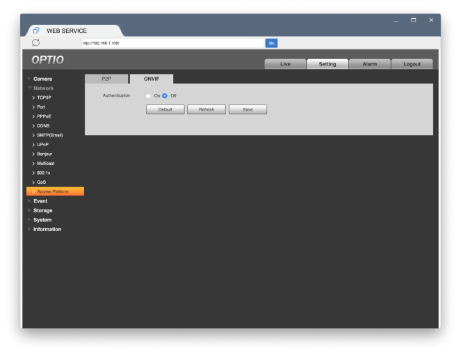 Login to the Optio Camera using EasyViewer and go to Settings > Network > Access Platform > ONVIF and turn Authentication OFF and click Save