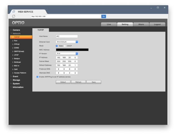 Login to the Optio Camera using EasyViewer and go to Settings > Network > TCP/IP
