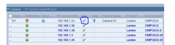 5. Log into the NVR and go to Main menu> Camera> Camera. Click on Edit button of a vacant channel.