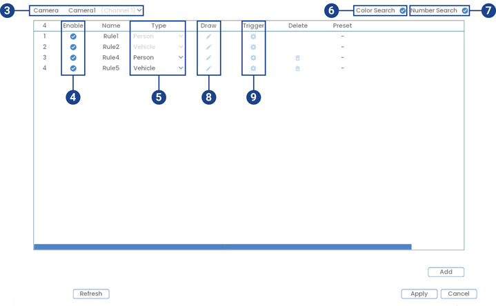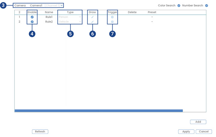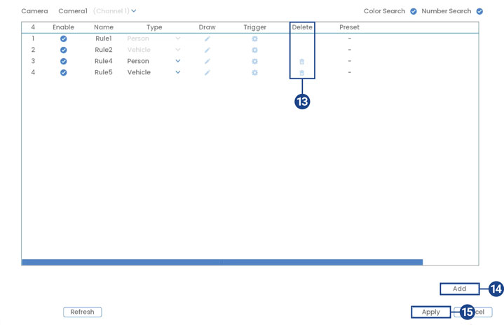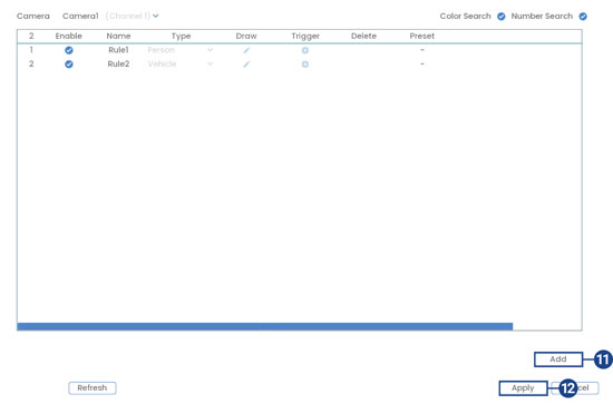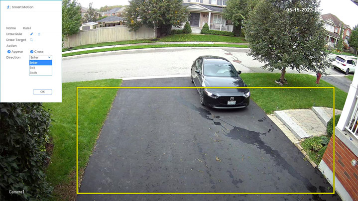 Note: The initial two smart motion detection rules are automatically included. The detection type for these default rules cannot be changed, and the areas can only be enabled or disabled. Subsequent rules added allow for modification or deletion of all details.