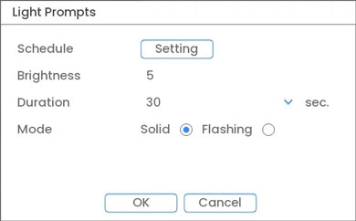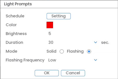 ◦ Warning Lights: Check to enable warning light. Click Setting to change the warning light mode to Flashing or choose how long the warning light will stay on following a face detection event. To learn more, see 14.1.1 Smart Motion Activated Warning Lights, page 52.