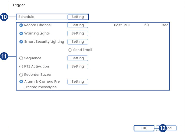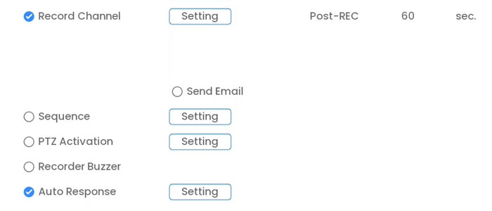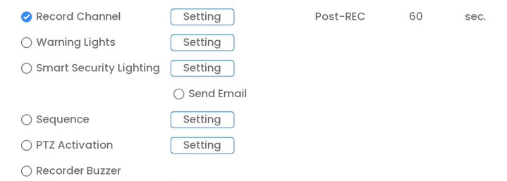 ◦ Record Channel: Select the cameras that will record when a face is detected. Set the length of recording following a face detection event in the Post-REC field.