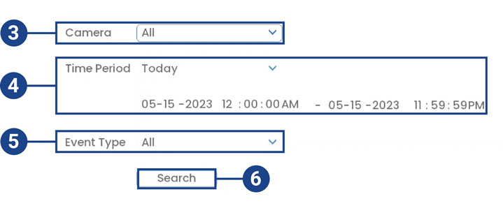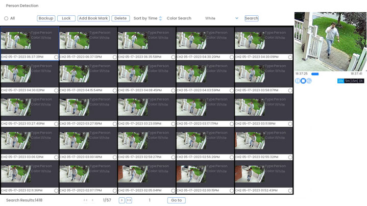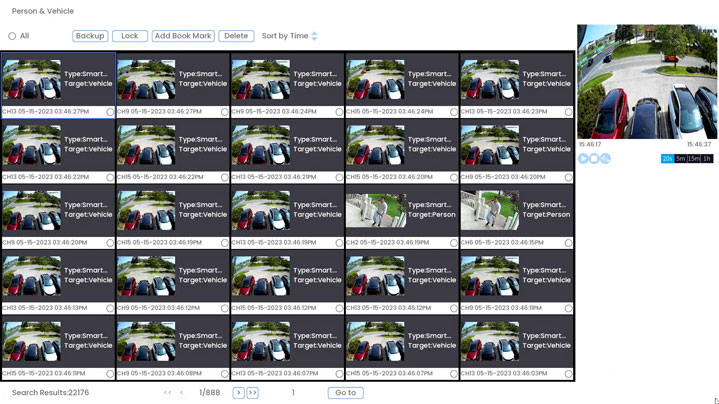 You can also search for face detection events on a specific camera or the entire system. You can also choose to back up events (USB flash drive required not included).To perform a Smart Search, see Searching for Person & Vehicle Detection (Smart Search) in Person & Vehicle Detection.