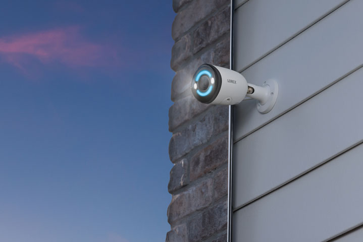 Certain Lorex IP wired deterrence cameras have a built-in, vibrant Smart Security Lighting positioned on the front of the camera. This feature allows users to customize different colored lighting modes or synchronize it with smart motion detection settings.