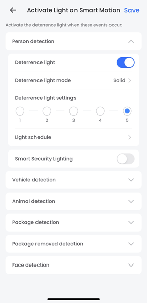 • Deterrence light settings: Adjust the brightness level of the lights (from 1 being the lowest to 5 being the highest).