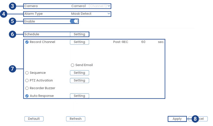 ◦ Auto Response: Check to enable an automatic audio response when a face is detected without a mask. Click Setting to create a schedule for auto response.