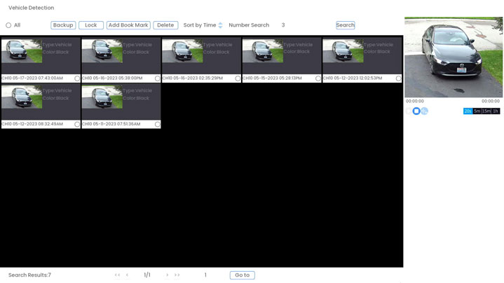 The system can filter, search, and browse for numbers on vehicle detection recordings. Each result has the snapshot, the plate number, and a video recording showing the capture.