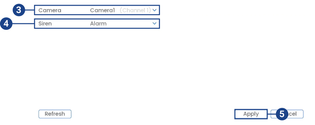 To configure the siren: 1. From the Live View display, right-click to open the Quick Menu, then click Main Menu. 2. Click Events, then Event Settings. Click the Siren tab from the side panel.